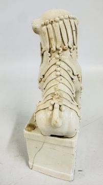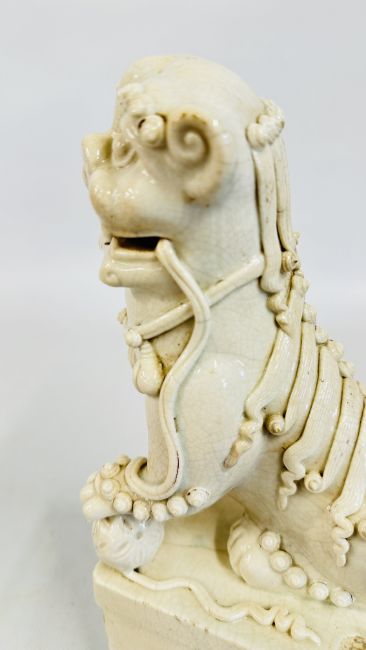 AN ANTIQUE BLANC DE CHINE DEHUA STYLE PORCELAIN MODEL OF A BUDDHIST LION / FOO DOG A/F, POSSIBLY QING, H 27CM.