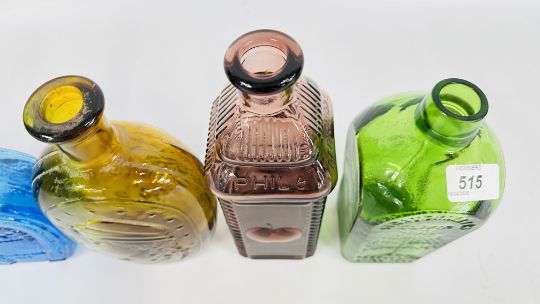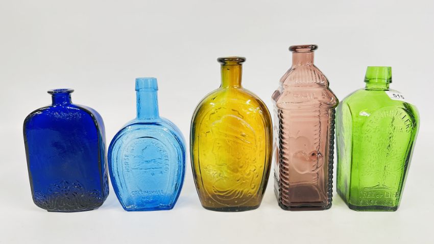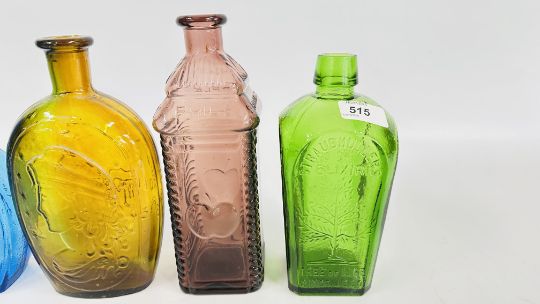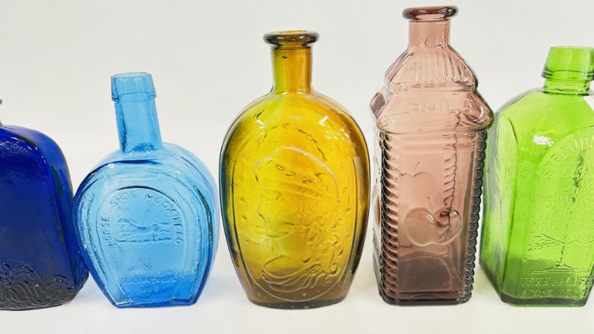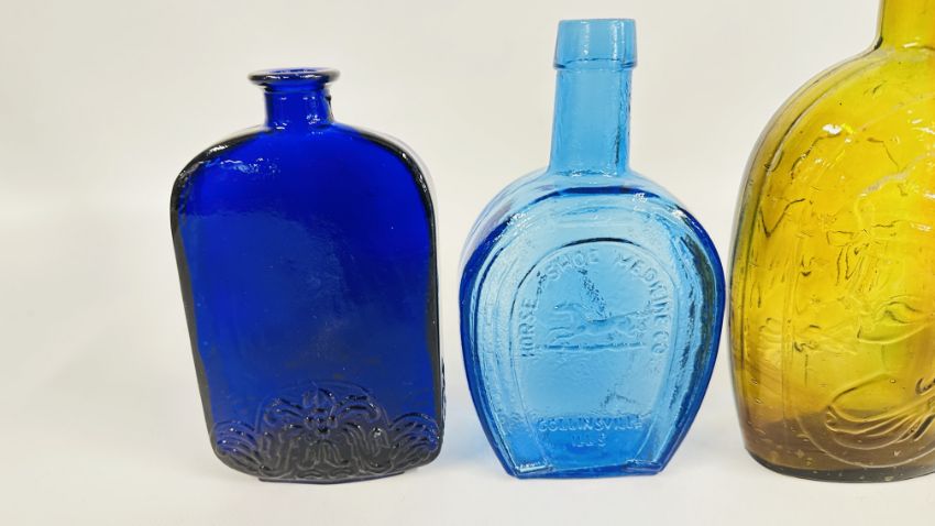 5 ASSORTED VINTAGE GLASS BOTTLES TO INCLUDE PHIL BERRING'S BITTERS, HORSE SHOE MEDICINE, NECTAR OF GOLDEN LIFE ETC.