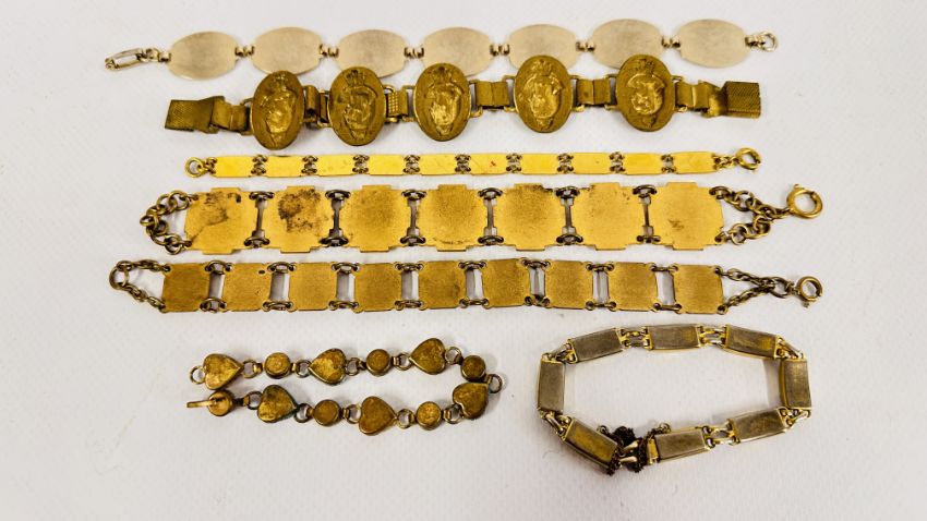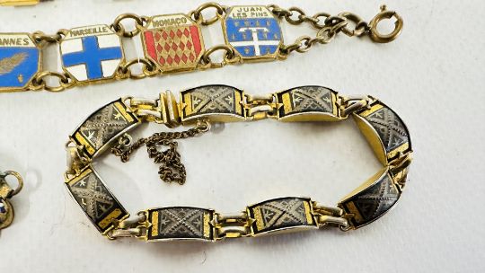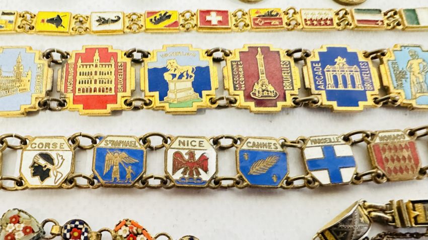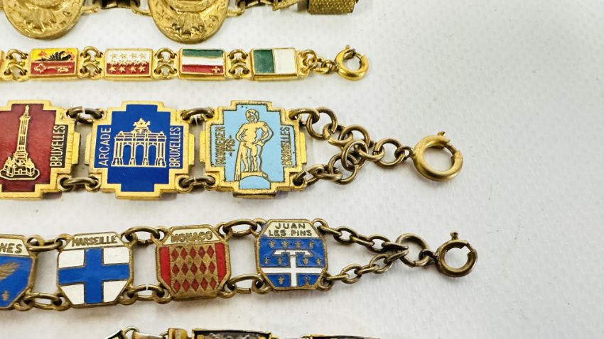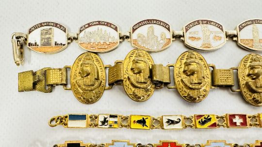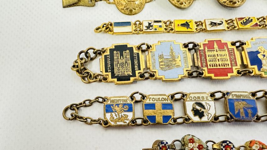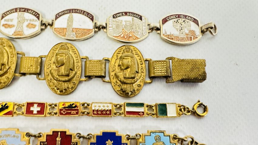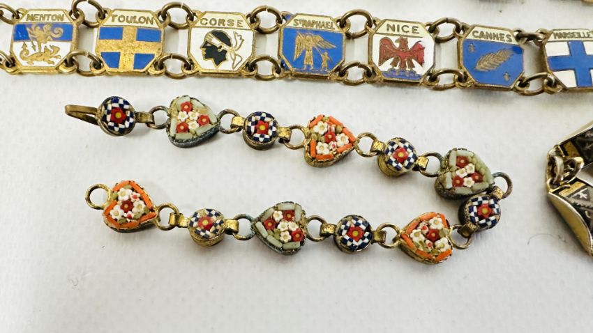 A GROUP OF 4 VINTAGE ENAMEL SOUVENIR BRACELETS + AN EGYPTIAN GILT EXAMPLE AND A MICRO MOSAIC EXAMPLE ETC.