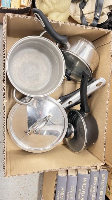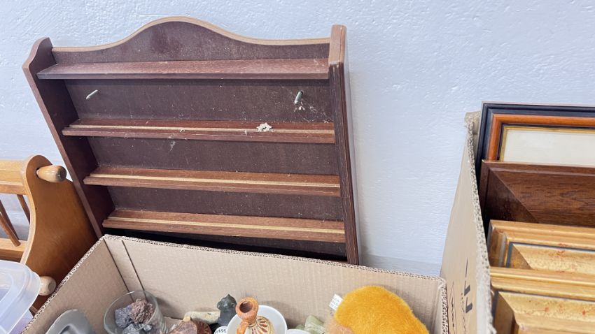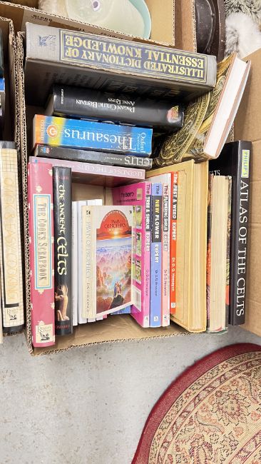 10 X BOXES AND A BASKET OF ASSORTED HOUSEHOLD SUNDRIES TO INCLUDE HOME ELECTRICALS, RUSSELL HOBBS IRON, BODI-TEK, MAGAZINE RACK, ORNAMENTS, RUSSELL HOBBS MICROWAVE, FRAMED PICTURES AND PRINTS, KITCHENALIA AND SOFT TOYS + 5 X BOXES OF ASSORTED BOOKS TO INCLUDE COLLINS ENCYCLOPEDIAS, CELTS REFERENCE BOOKS.