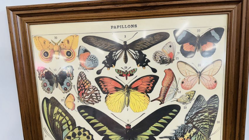 A GROUP OF COLLECTIBLES TO INCLUDE A VINTAGE PEWTER TANKARD, DECANTER LABELS, INKWELL AND CRAB FORKS + 3 ACME BATES AND SON SERVING SPOONS, MAPS, PORTMEIRON BUTTER DISH, BRASS MEASURES ETC. + A FRAMED BUTTERFLY AND MOTH PRINT.