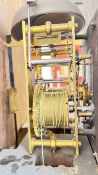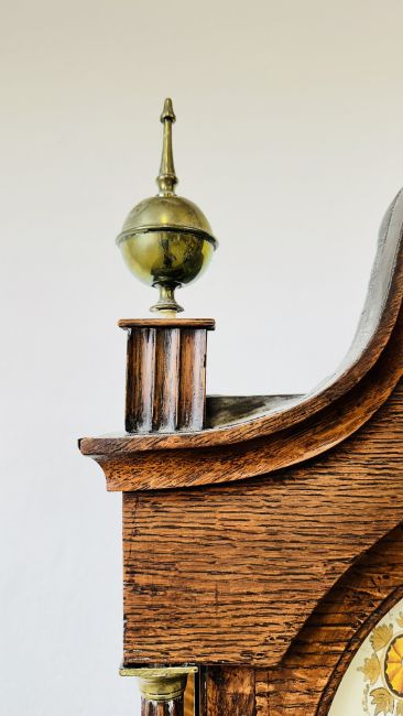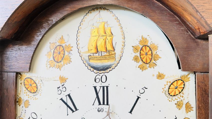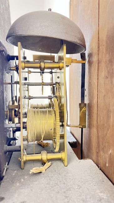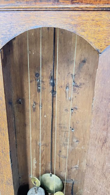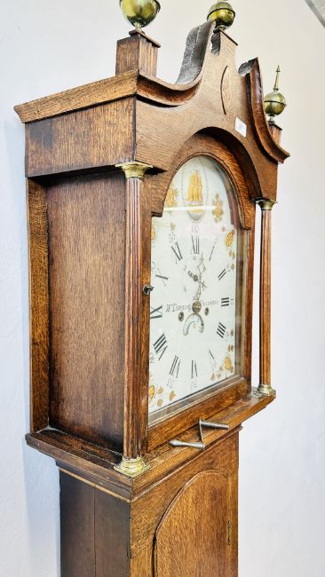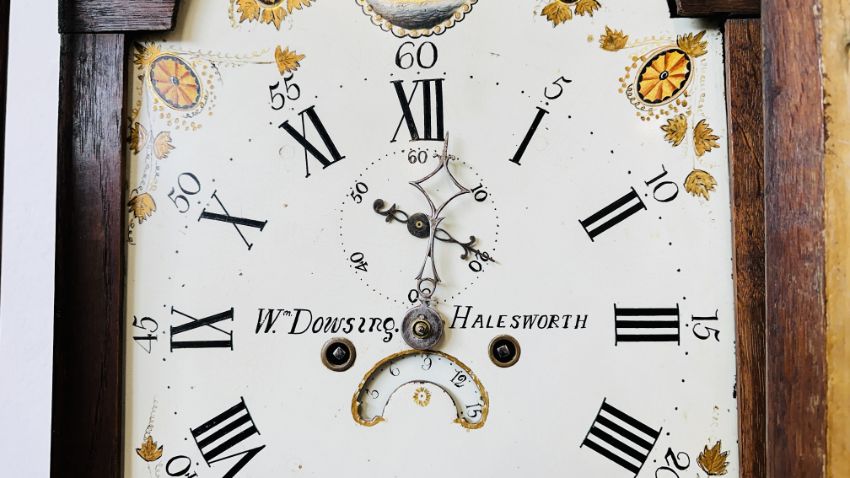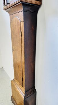 AN EARLY C19TH OAK ARCHED DIAL LONG CASE CLOCK, THE PAINTED FACE WITH ROMAN NUMERALS INSCRIBED W DOWSING HALESWORTH, THE MOVEMENT WITH SUBSIDIARY SECONDS AND CALENDAR WHEEL, STRIKING ON A BELL (MINOR LOSSES).