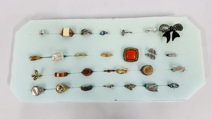 A GROUP OF 28 ASSORTED DRESS RINGS TO INCLUDE STONE SET AND ENAMEL EXAMPLES.