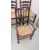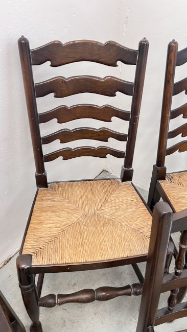 A PORCELAIN STICK STAND WITH ASSORTED STICKS AND UMBRELLAS + 4 ASSORTED OAK FRAMED CHAIRS INCLUDING RUSH SEATED, CHILD'S ARM CHAIR, ETC.