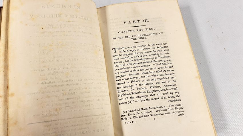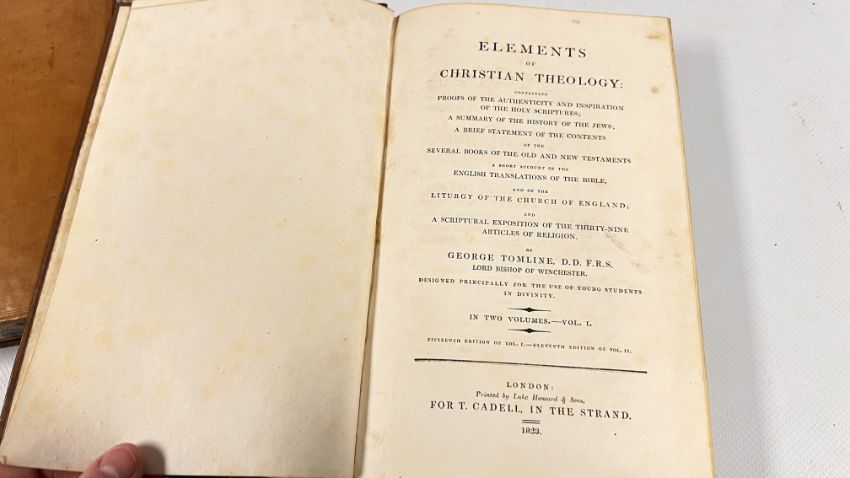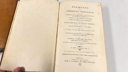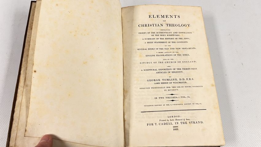 ELEMENTS OF CHRISTIAN THEOLOGY BY GEORGE TOMLINE. COMPLETE IN 2 VOLUMES. PUBLISHED IN LONDON: PRINTED FOR T. CADELL IN THE STRAND, 1823/22. FULL POLISHED CALF. REPRINT. SOME FOXING TO THE BLANKS, ELSEWHERE OF LESSER DEGREES. ALL EDGES MARBLED. BANDED SPINES WITH TITLE PLATES PRESENT.