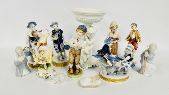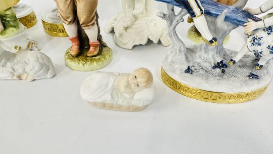 A GROUP OF ASSORTED FIGURINES AND FIGURED GROUPS TO INCLUDE HARD PASTE AND CONTINENTAL EXAMPLES.