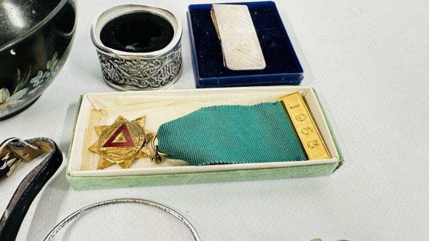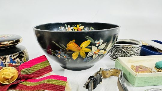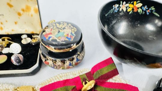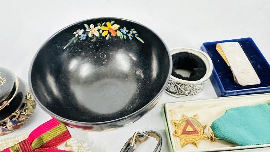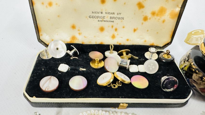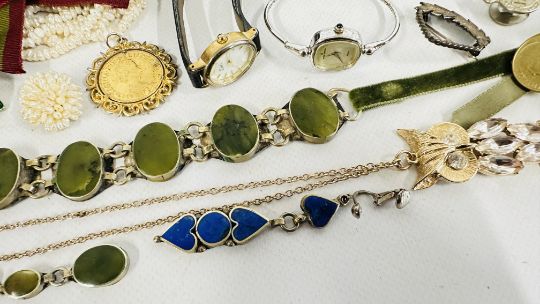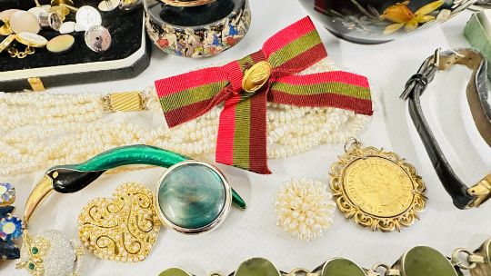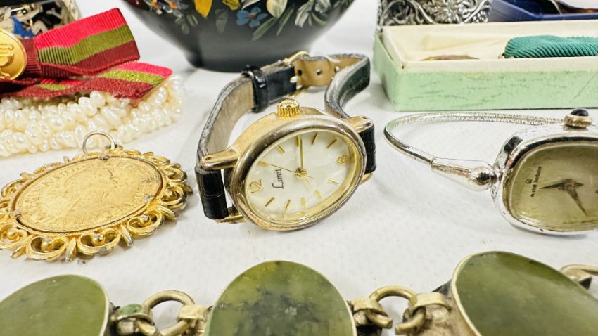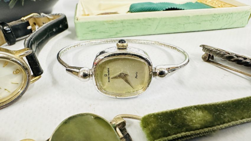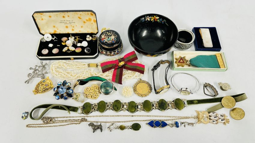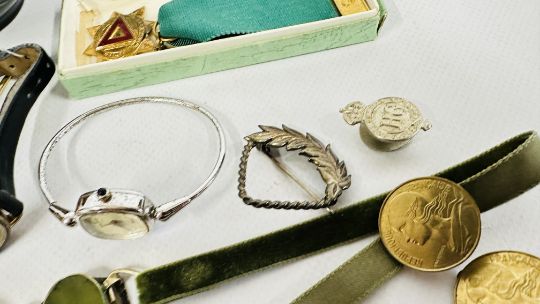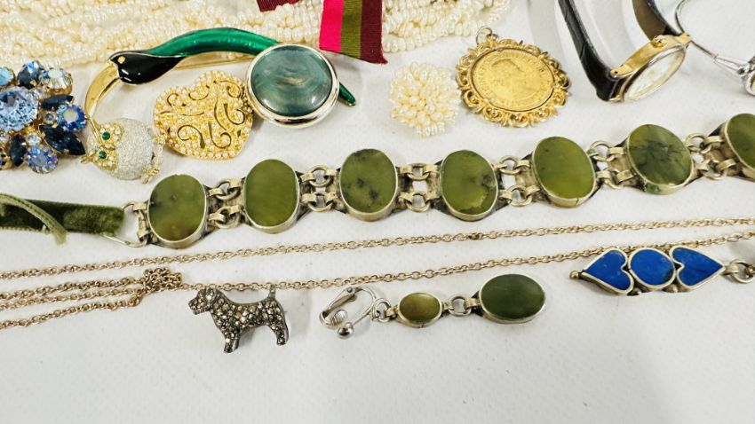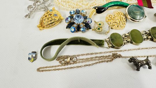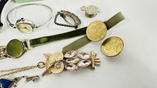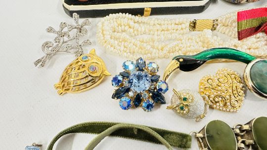 A BOX OF ASSORTED COSTUME JEWELLERY AND BROOCHES, WATCHES, EARRINGS ETC.