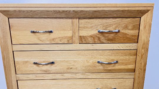 A GOOD QUALITY SOLID OAK 2 OVER 3 DRAWER CHEST, W 90CM X D 45CM X H 94CM.