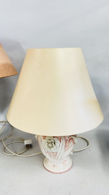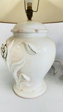 A MODERN CERAMIC VASE, COLUMN IN THE FORM OF A STANDING LADY, HEIGHT 41CM + TWO SIMILAR GRADUATED ITALIAN LAMP BASES.