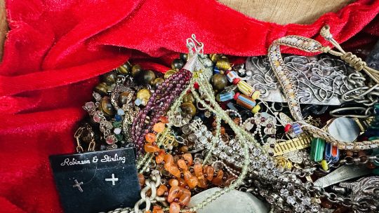 A VINTAGE CARVED HARD WOOD BOX AND CONTENTS TO INCLUDE VINTAGE AND MODERN COSTUME JEWELLERY BEADED NECKLACES, WATCHES AND BRACELETS, TIGER EYE NECKLACE, BELCHER CHAIN ETC & WATCH CHAINS.