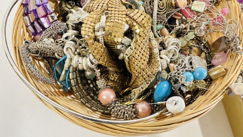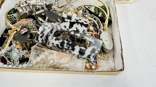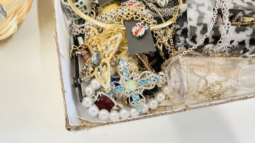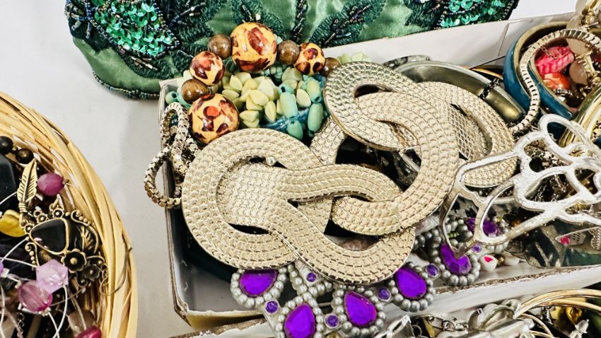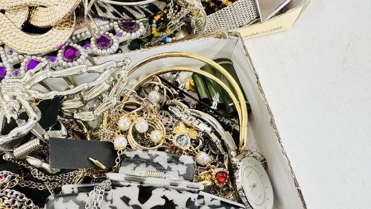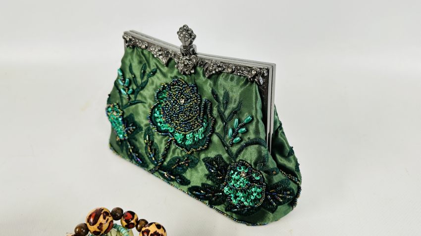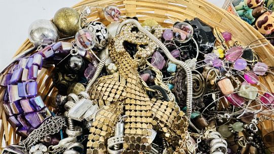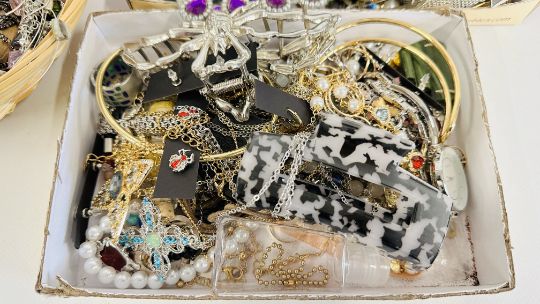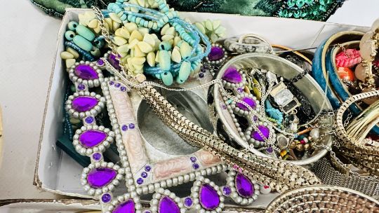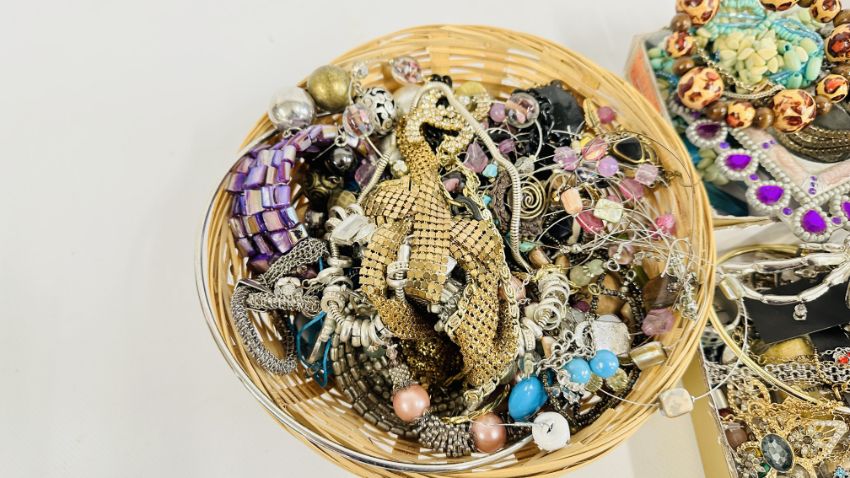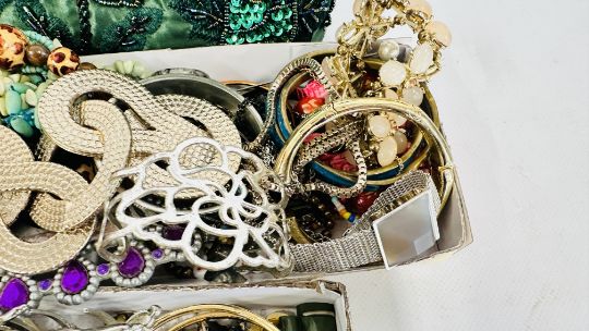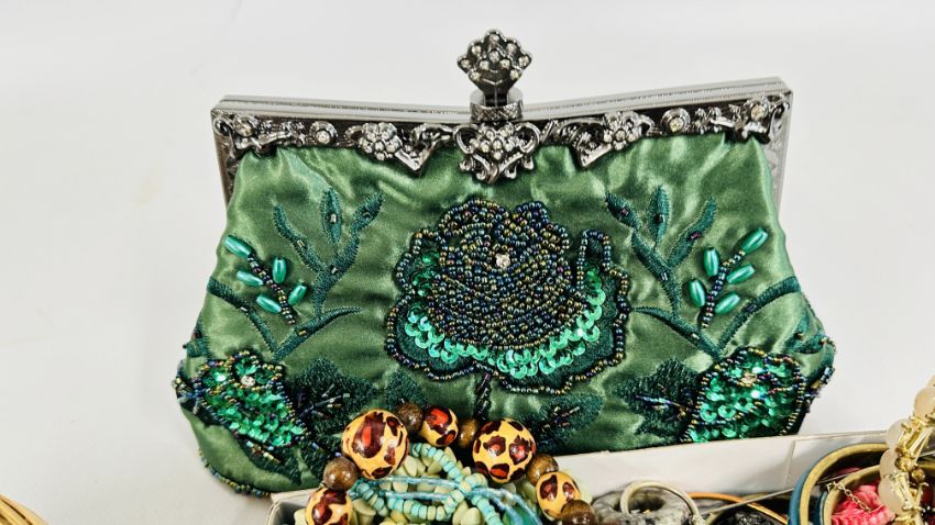 AN EXTENSIVE GROUP OF ASSORTED COSTUME JEWELLERY TO INCLUDE BANGLES, BEADED NECKLACES, HAIR ACCESSORIES ETC. + A BEADED EVENING BAG.