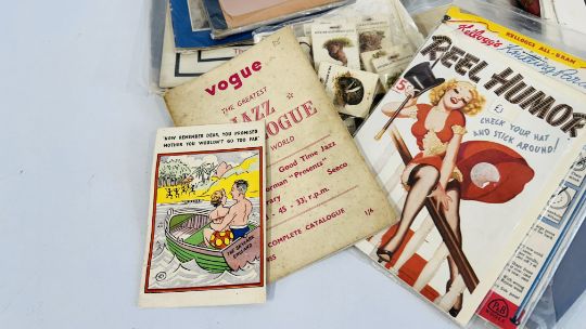 A BOX CONTAINING A GROUP OF ASSORTED VINTAGE EPHEMERA TO INCLUDE PHOTOGRAPHS AND MAGAZINES, COMIC POSTCARDS ETC.
