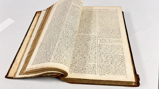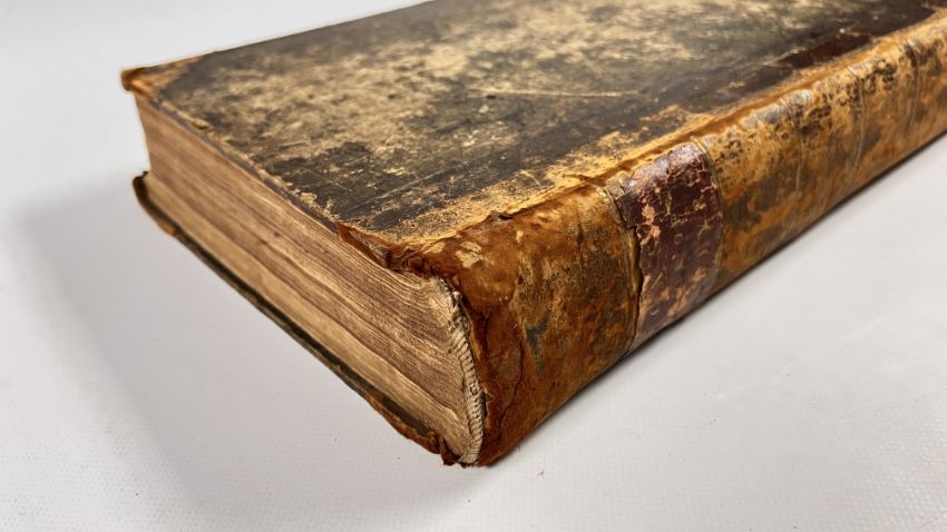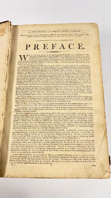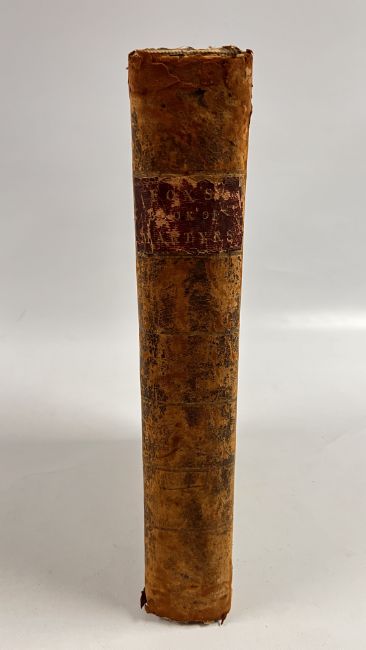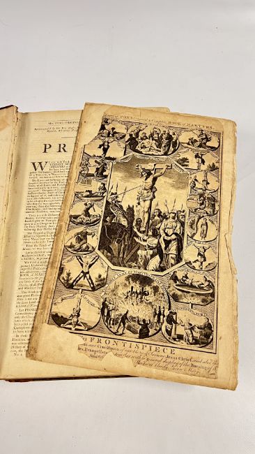 FOX'S BOOK OF MARTYRS BOUND IN WELL WORD HALF CALF WITH HEAVILY SCUFFED BOARDS. MOROCCO TITLE PLATE PRESENT TO THE UPPER SPINE, CHIPPED - LACKING TITLE PAGE AND BLANKS - PUBLISHED c1750. FRONTIS PRESENT, BUT DETACHED, CHIPPED TO THE EDGES, WITH LOSS TO THE UPPER AND LOWER SECTION - LAID DOWN. BLOCK GENERALLY SOUND, THOUGH WITH THE ODD CLOSED TEAR OR STAIN. PAGINATION ERRATIC IN PLACES, THOUGH CATCH-WORDS IMPLICATE COMPLETE. 44 OF THE LISTED 49 PLATES ARE PRESENT, THOUGH A FEW INCORRECTLY BOUND IN THE WRONG PLACE, HOWEVER, 5 PLATES ARE PRESENT THAT APPEAR EXTRA, INCLUDING ONE OF HENRY VIII. 952pp.