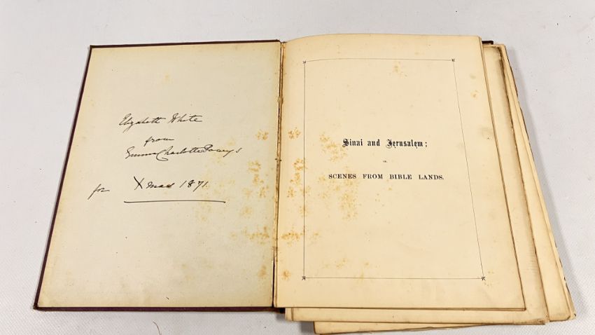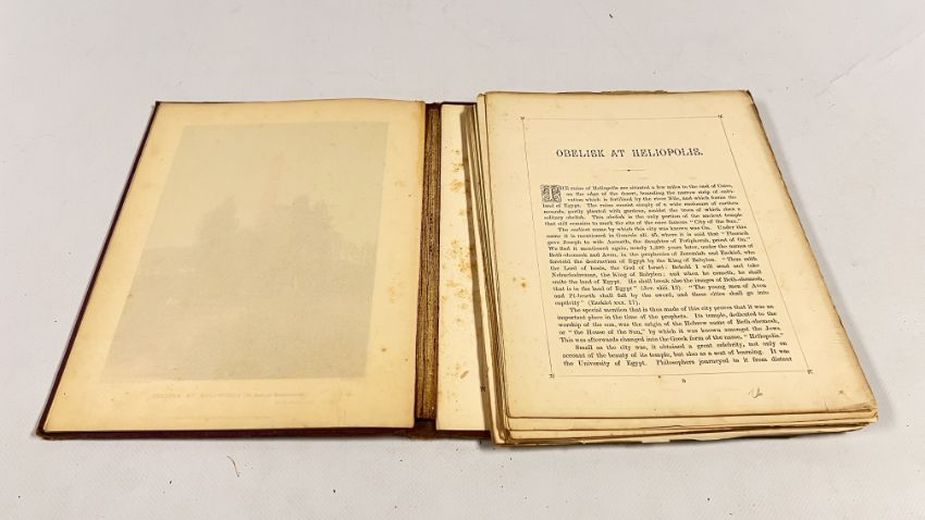 SINAI AND JERUSALEM, OR SCENES FROM BIBLE LANDS BY THE REV F.W. HOLLAND. PUBLISHED SPCK. N.D. c1871 (PREVIOUS OWNERS INSCRIPTION). 12 COL. PLATES, AS PER LIST, ONE FOLDING. NEAR DISBOUND, OWING TO THE GUTTA - PERCHA USED IN BINDING. 52pp - SCATTERED FOXING.
