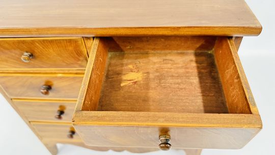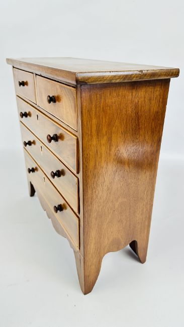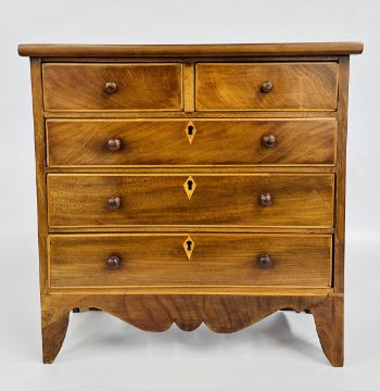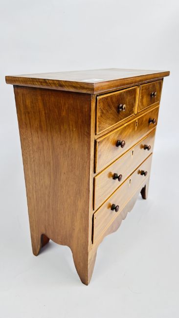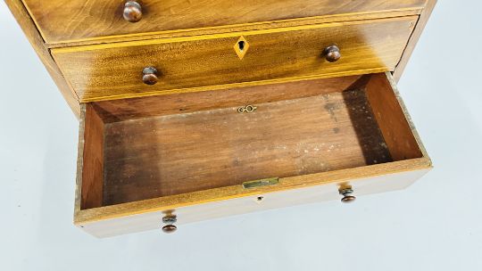 ANTIQUE MAHOGANY AND INLAID APPRENTICE CHEST, W 41CM X D 17CM X H 42CM.