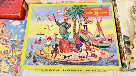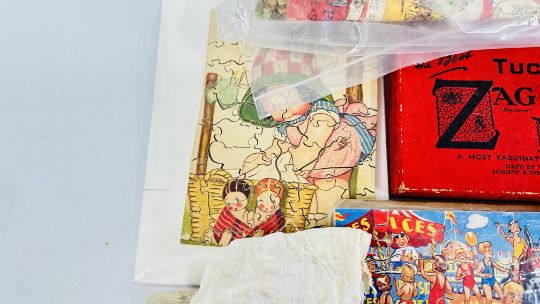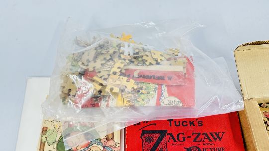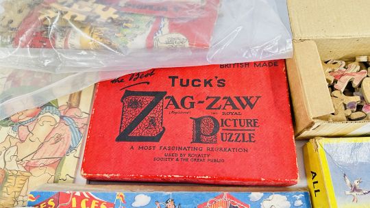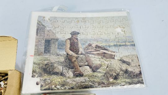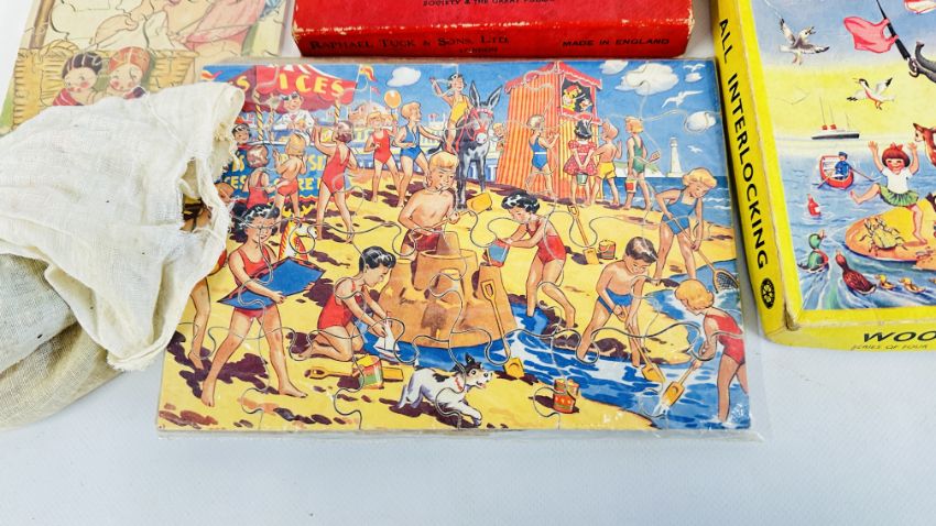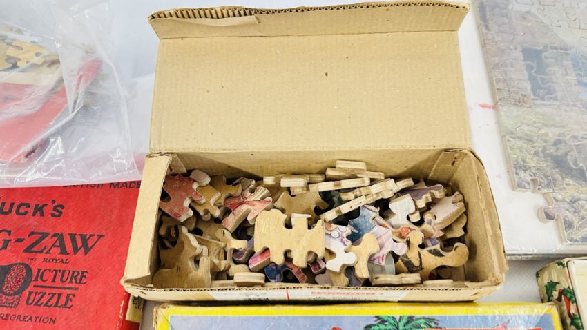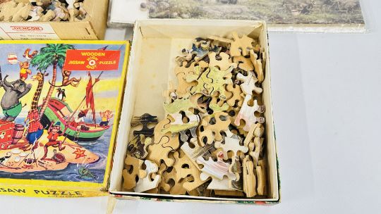 A GROUP OF VINTAGE JIGSAW PUZZLES TO INCLUDE WOODEN EXAMPLES (NOT GUARANTEED COMPLETE).