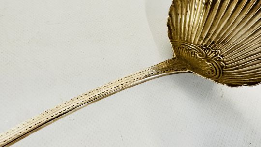 AN ANTIQUE SOLID SILVER LADLE, LONDON 1789, MAKER SAMUEL GODBEHERE & EDWARD WIGAN (OVER STAMPED MAKERS MARK), L 35CM.