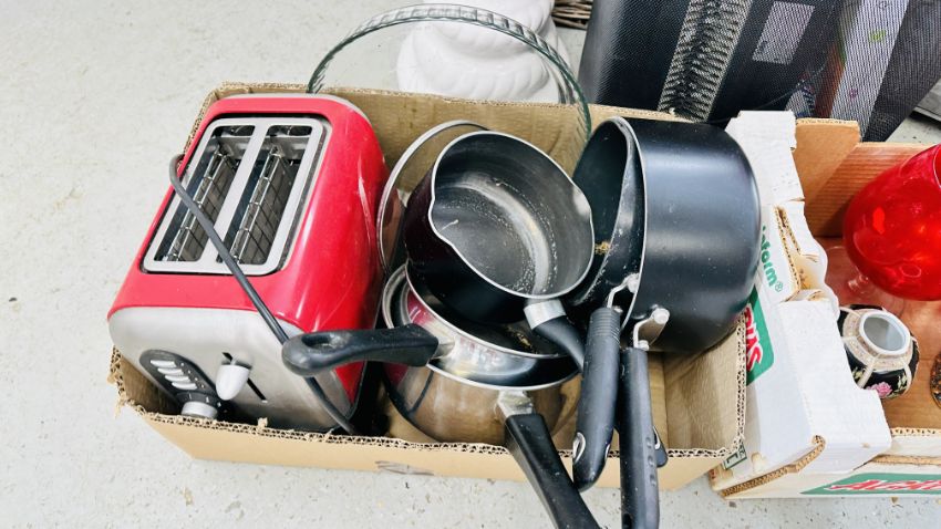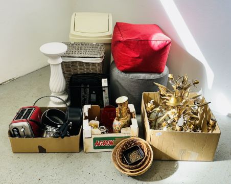 A GROUP OF THREE TV'S TO INCLUDE SONY BRAVIA 40" (KDL40V4000), SONY BRAVIA 26" (KDL26U3000), MOGEN LCD 15" TV (NO CABLE) AND A MATSUI DVD PLAYER - SOLD AS SEEN + A GROUP OF ASSORTED HOUSEHOLD SUNDRIES TO INCLUDE POTS, 2 SLOT TOASTER, PAPER SHREDDER, WICKER LAUNDRY BASKET, GILT CHANDELIER, 2 POUFFES ETC.