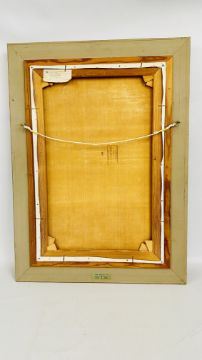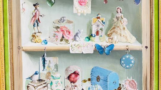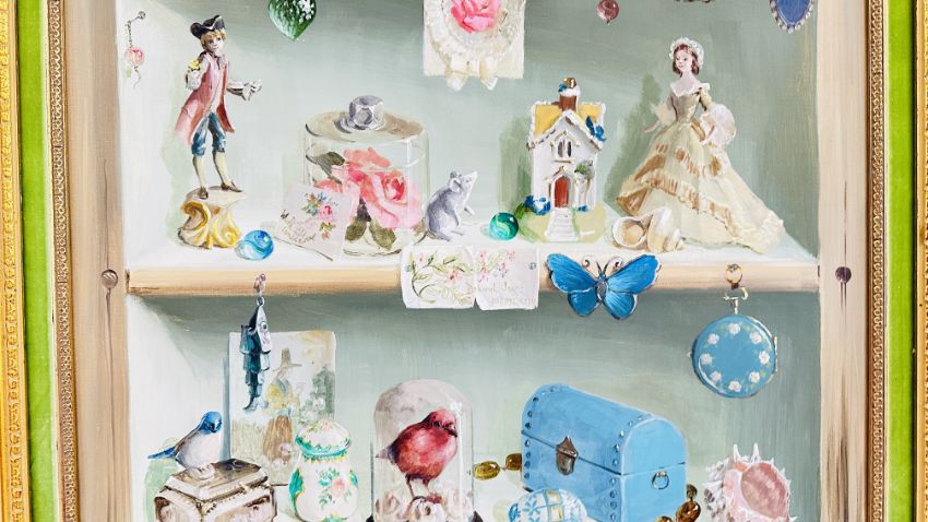 DEBORAH JONES (BRITISH 1912 - 2012): GILT FRAMED TROMPE L'OEIL OIL PAINTING TITLED "DOLL CUPBOARD", W 49.5 X H 74.5CM SIGNED.