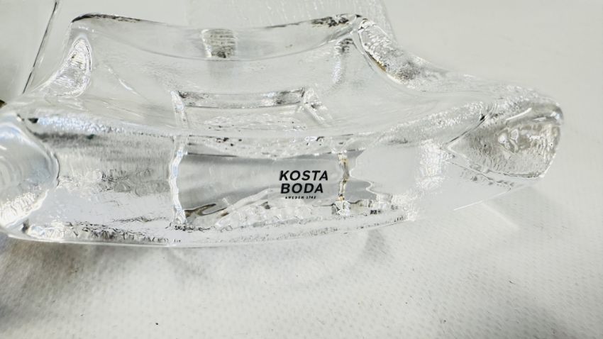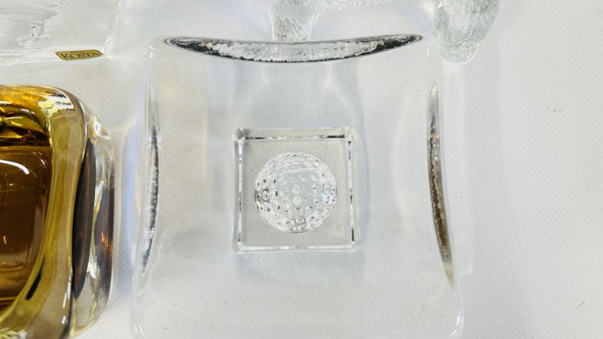 5 X PIECES OF GOOD QUALITY SWEDISH "KOSTA BODA" GLASS TO INCLUDE PAPERWEIGHTS ALL RETAINING ORIGINAL LABELS + AN ART GLASS WATER PIPE, UNKNOWN MAKER.