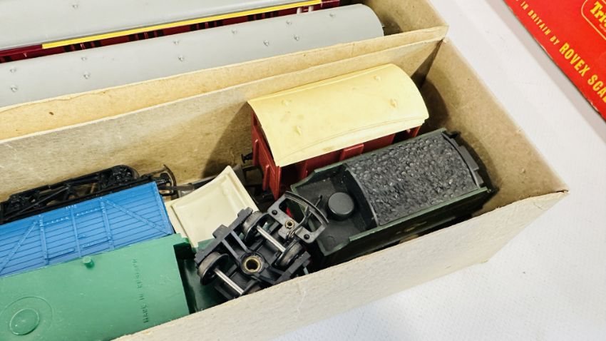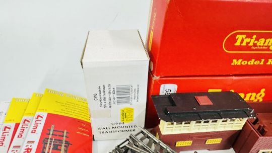 A GROUP OF ASSORTED HORNBY AND OTHER TO INCLUDE ROLLING STOCK, TRACK AND COACHES.