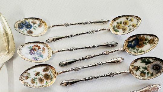 A GROUP OF 3 SILVER APOSTLE SPOONS + A FURTHER 4 SILVER SPOONS VARIOUS DATES AND MAKERS + A SET OF SIX SILVER SPOONS BIRMINGHAM 1947 MAKER R & D, SET OF 6 ENAMEL SPOONS MARKED 90 + ONE OTHER.