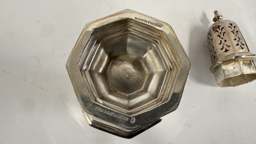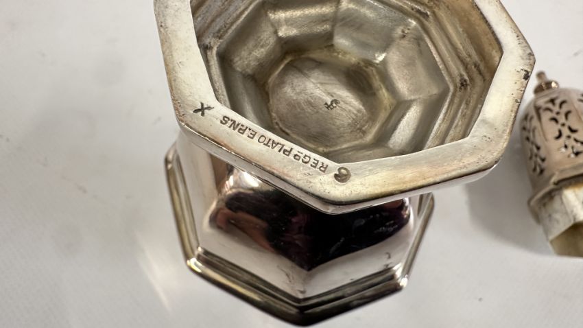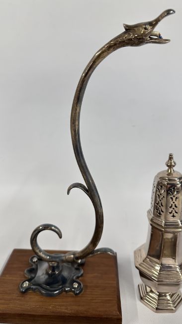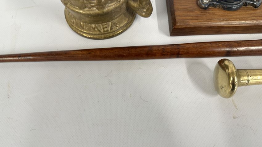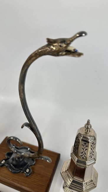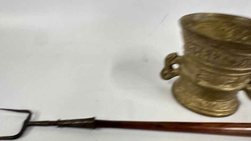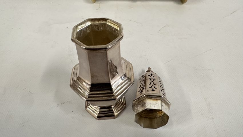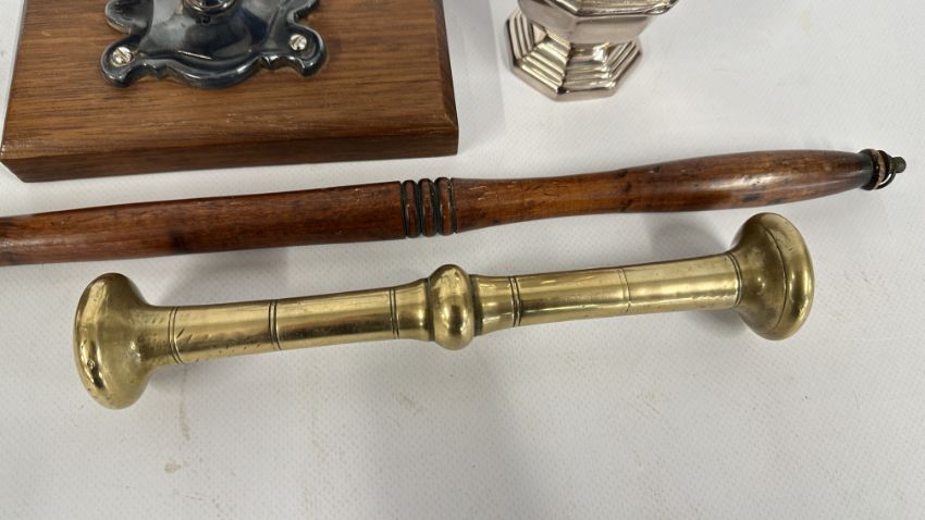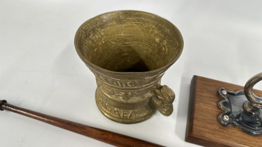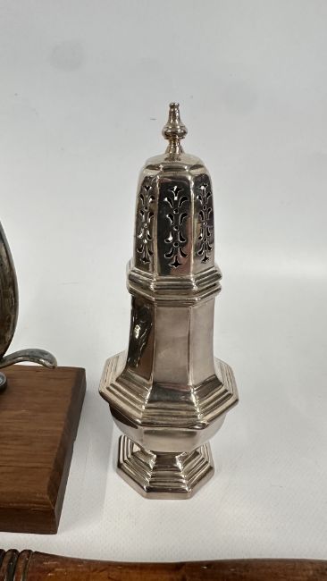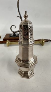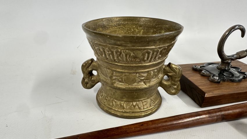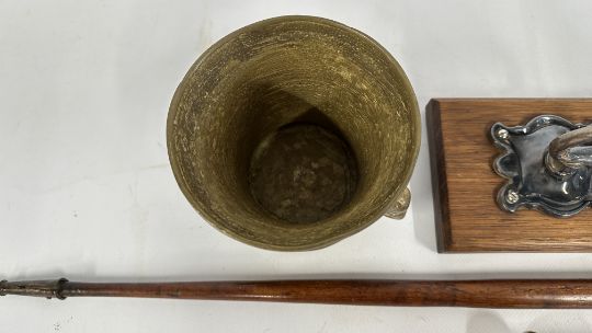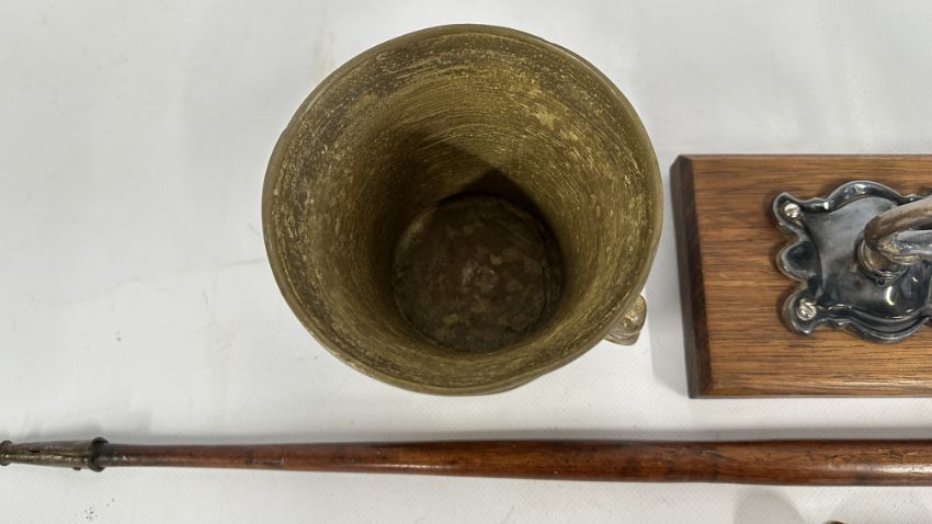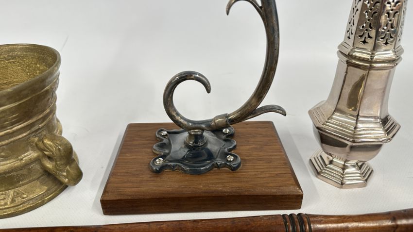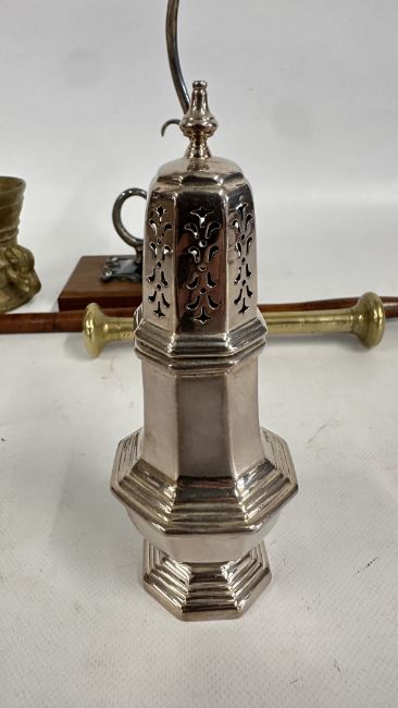 A VINTAGE BRASS PESTLE & MORTAR, SILVER PLATED LIGHT FITTING & ANTIQUE TOASTING FORK, PLATED SUGAR SHAKER.