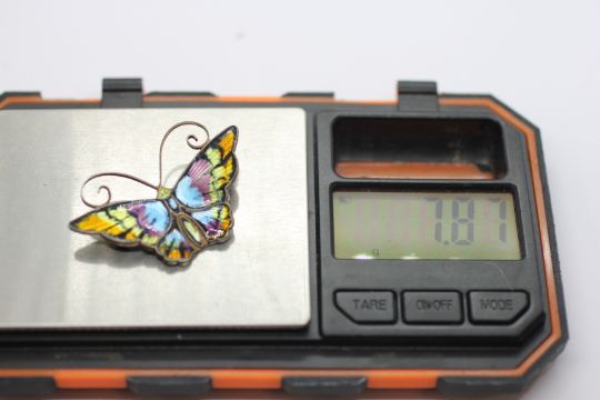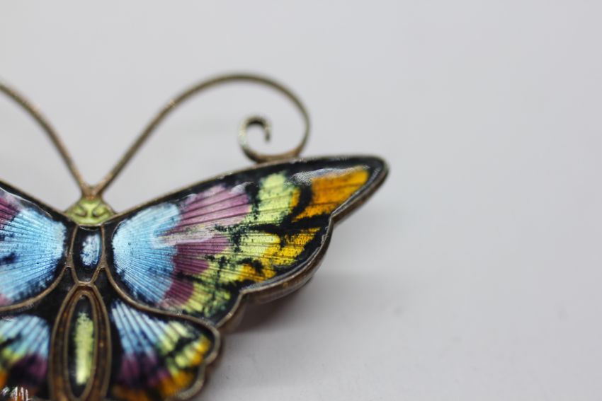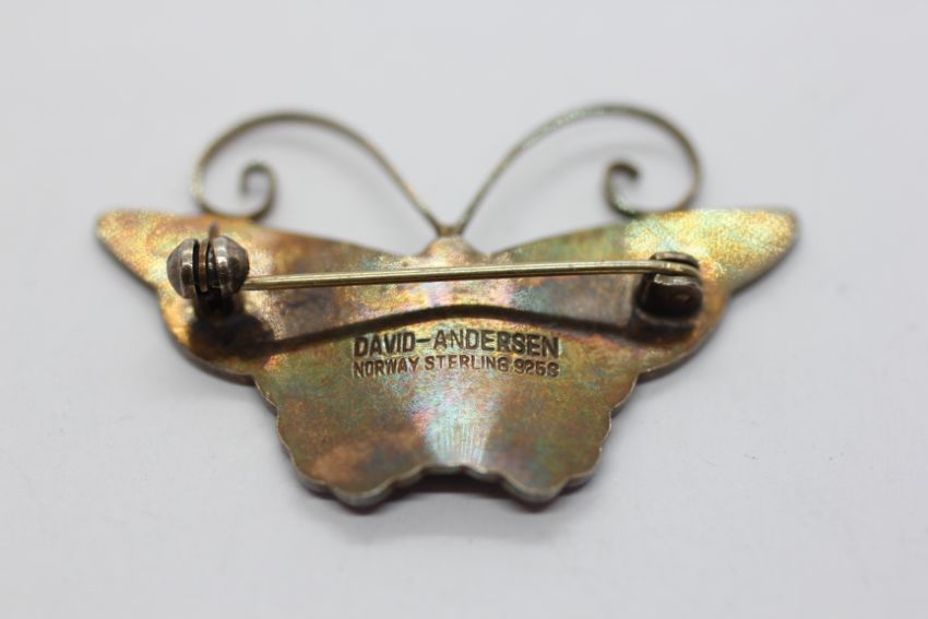 A DAVID ANDERSON NORWEGIAN SILVER GILT AND ENAMEL MULTI COLOURED BUTTERFLY BROOCH.