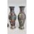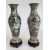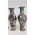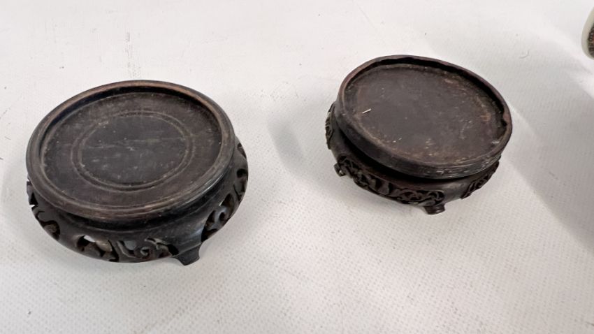 AN IMPRESSIVE MATCHED PAIR OF CHINESE PORCELAIN QING DYNASTY PERIOD VASES OF ELONGATED BALUSTER FORM FEATURING A DENSE SCROLLING GROUND AND A STYLIZED TAOTIE MASK MOTIF, H 25.5CM + TWO CARVED OPEN WORK STANDS.