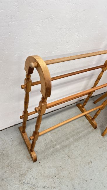 PINE TOWEL HORSE, THREE BEECHWOOD CHAIRS AND METAL CRAFT STANDARD LAMP (CABLE REMOVED).