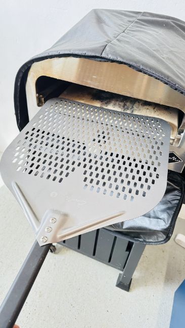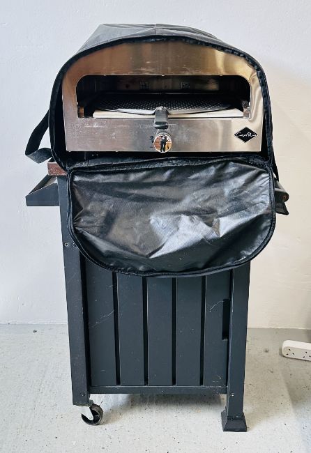 A CASA MIA GAS PIZZA OVEN WITH STAND, COVER AND PEEL.