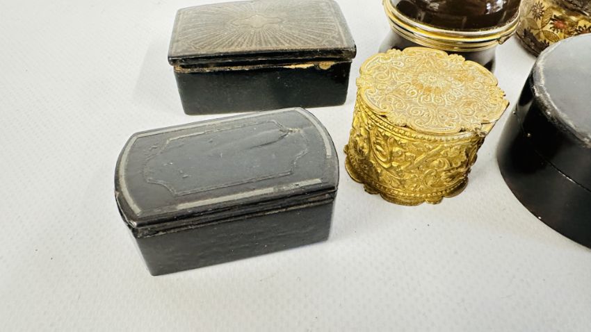 A GROUP OF VINTAGE SNUFF AND TRINKET BOXES TO INCLUDE A GILDED EXAMPLE + A MODERN H. SAMUEL ENAMEL RING BOX.