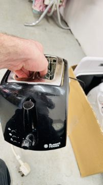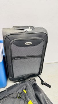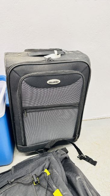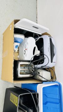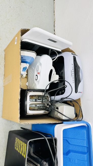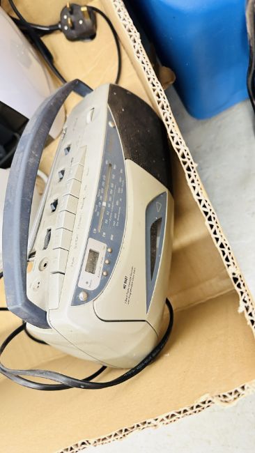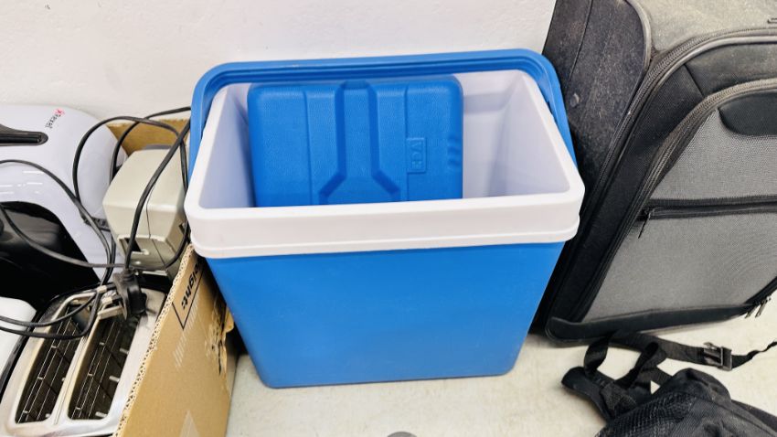 GROUP OF GOOD QUALITY HOUSEHOLD GOODS TO INCLUDE ASAKLITT SUITCASE, HORIZON BACKPACK, COOL BOX, ELECTRICALS TO INCLUDE REXEL PAPER SHREDDER, PHILLIPS CLOTHES IRON, RUSSELL HOBBS TWO SLOT TOASTER, ROBERTS RC9907 RADIO CASSETTE RECORDER, ETC - SOLD AS SEEN.