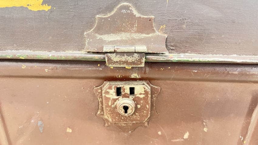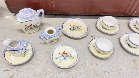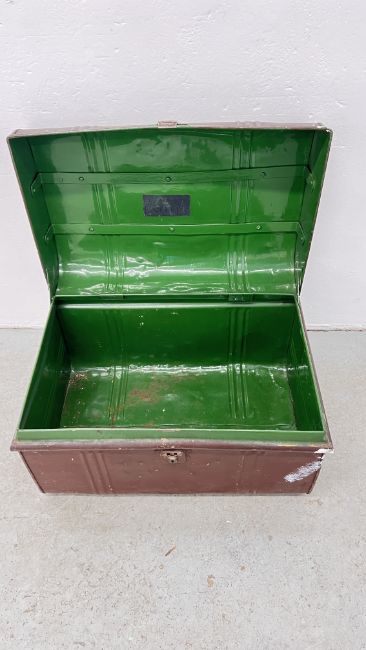 A VINTAGE TWO HANDLED TIN TRUNK TO INCLUDE A VINTAGE CHILD'S TEA SET, TWO GRADUATED SERVING TUREENS (NO COVERS) ALONG WITH A HAND PAINTED CLOWN BUST PLANTER (HAIRLINE CRACK).