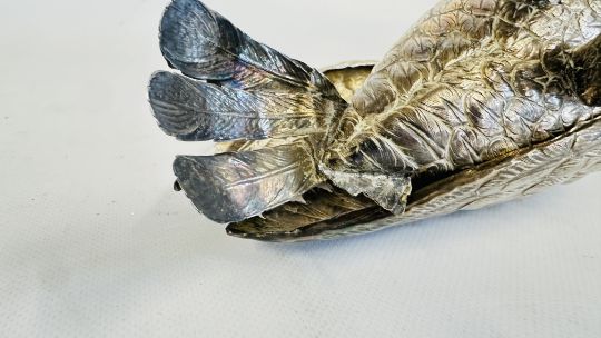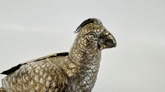 AN EXQUISITE ANTIQUE GERMAN IMPORT SILVER VESSEL FASHIONED AS A GROUSE HAVING HINGED WINGS AND DETACHABLE HEAD, LONDON 1893, MAKER B. MULLER & SON (BERTHOLD MULLER), H 19CM X L 25CM (REQUIRES ATTENTION).