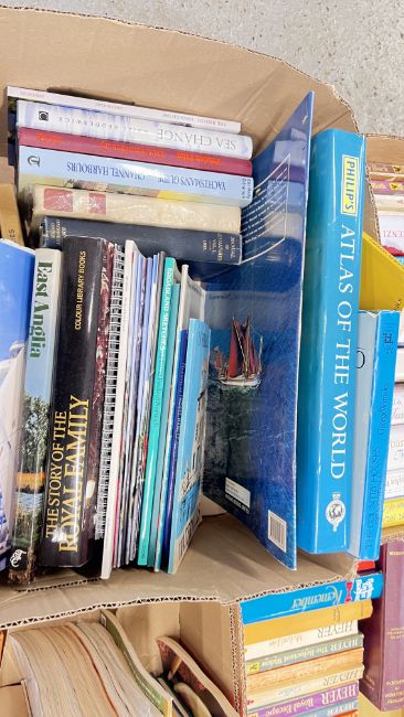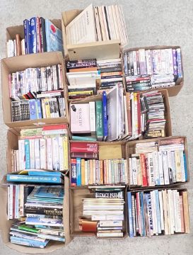 13 X BOXES OF ASSORTED BOOKS, CD'S, DVD'S AND RECORDS, THE BOOKS TO INCLUDE GEORGETTE HEYER, VARIOUS TITLES RELATING TO ENGLISH ROYAL FAMILY, BARBARA TAYLOR BRADFORD, FICTION AND NON FICTION, THE RECORDS TO INCLUDE ELTON JOHN AND THE CARPENTERS ETC.