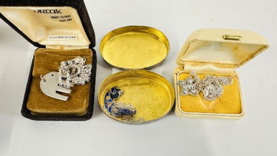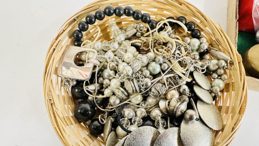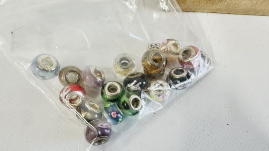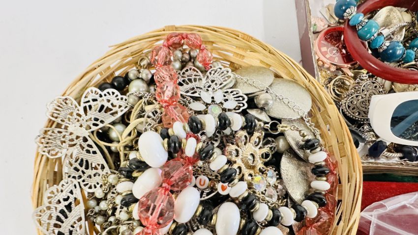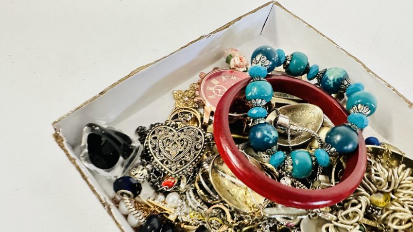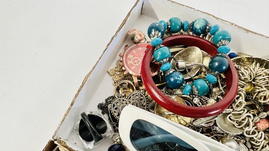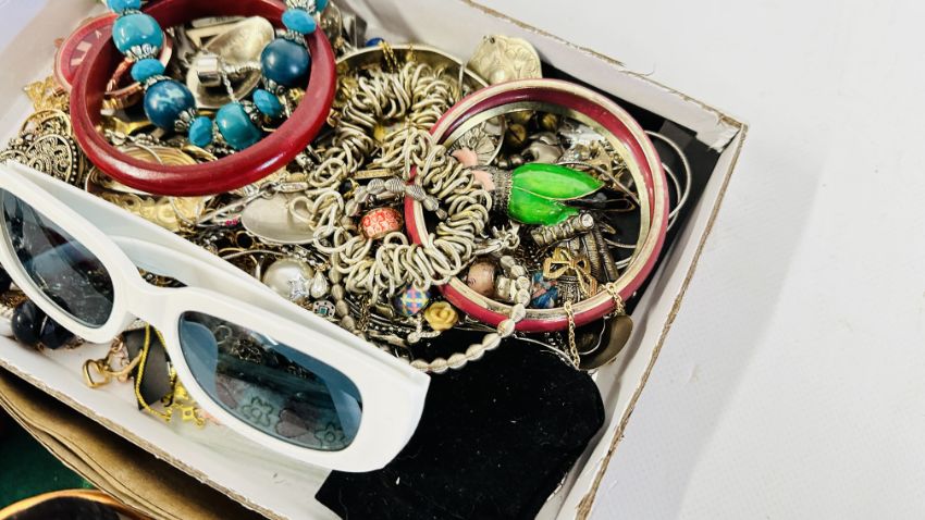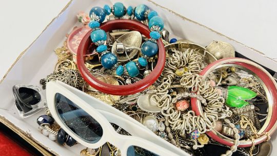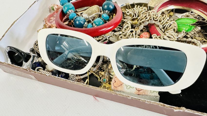 AN EXTENSIVE GROUP OF ASSORTED COSTUME JEWELLERY TO INCLUDE BANGLES, BEADED NECKLACES, SUNGLASSES, WHITE METAL PENDANT NECKLACES ETC + A GROUP OF CHARMS.