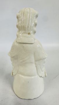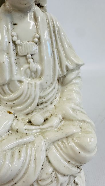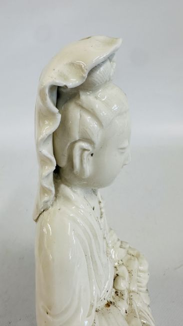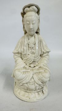 AN ANTIQUE BLANC DE CHINE DEHUA STYLE PORCELAIN MODEL OF A SEATED DEITY MEDITATING ON A LOTUS SHAPED BASE, H 26.5CM.