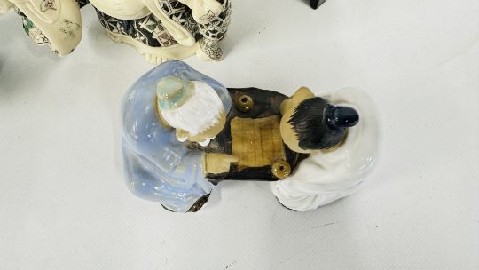 A GROUP OF MODERN JAPANESE FIGURES IN GROUPS + A JAPANESE CARVED FOLDING TABLE SCREEN ALONG WITH A RESIN CARVING OF A MAN HOLDING CHILDREN.