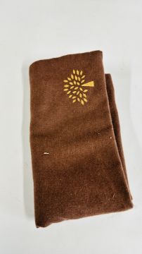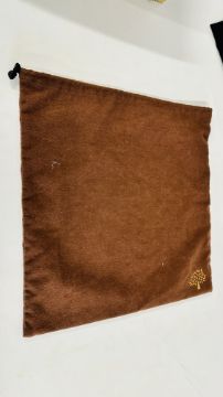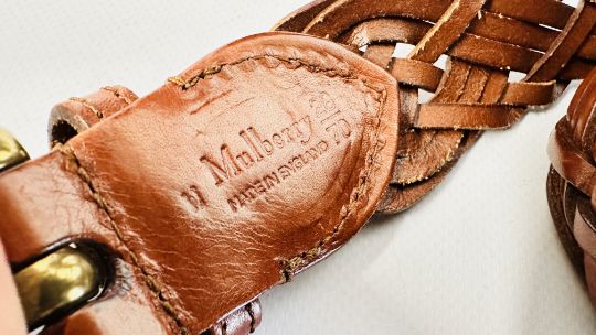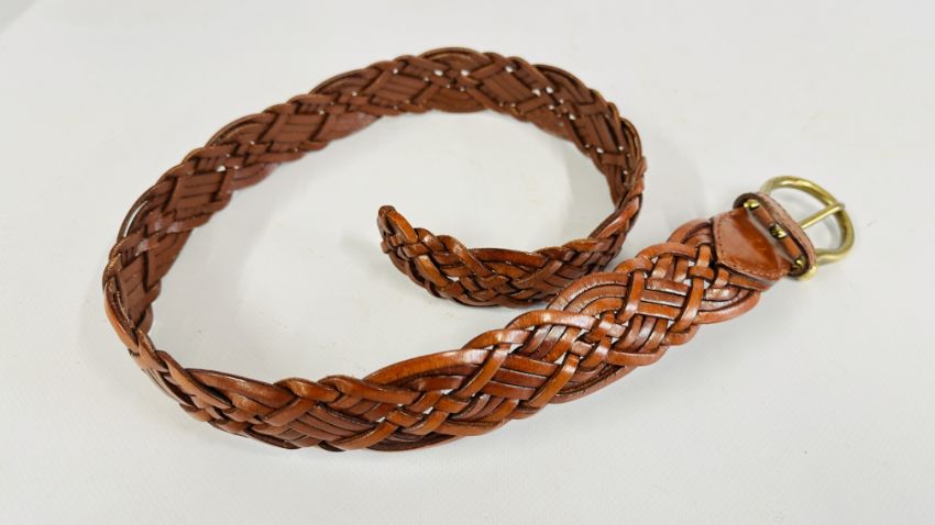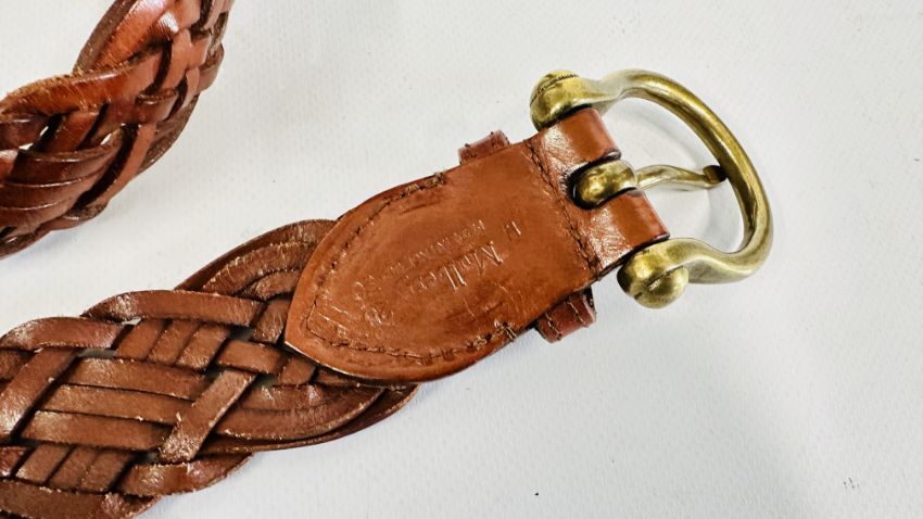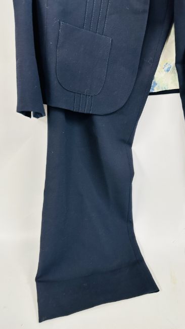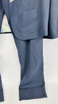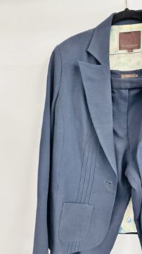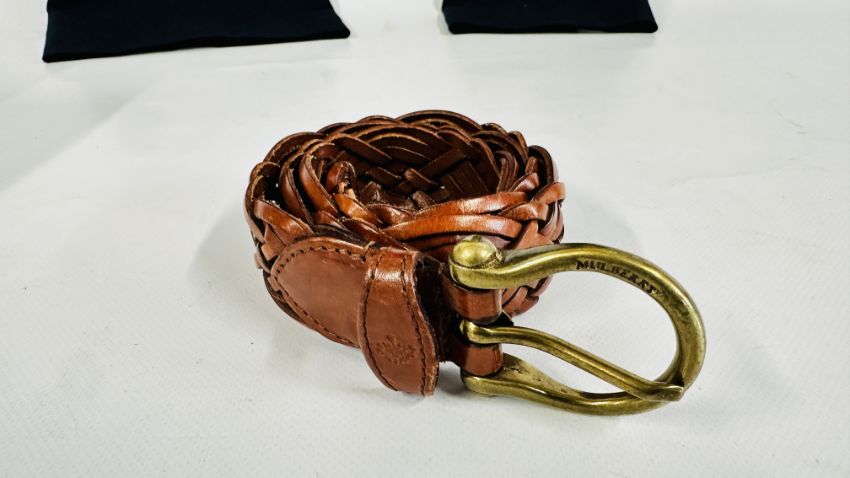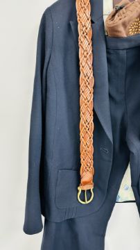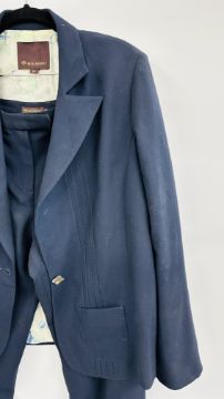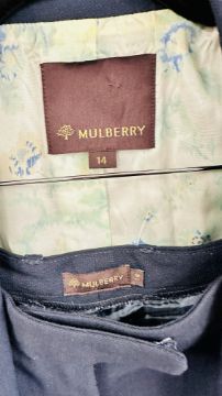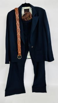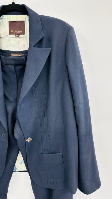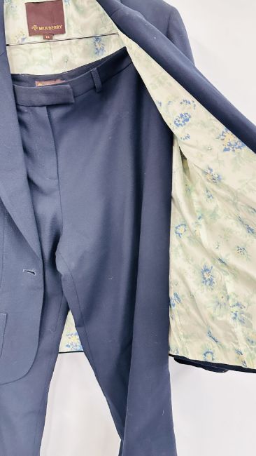 A MULBERRY DESIGNER LADIES TWO PIECE NAVY BLUE TROUSER SUIT, SIZE 14 TOGETHER WITH A MULBERRY LEATHER WOVEN BELT.