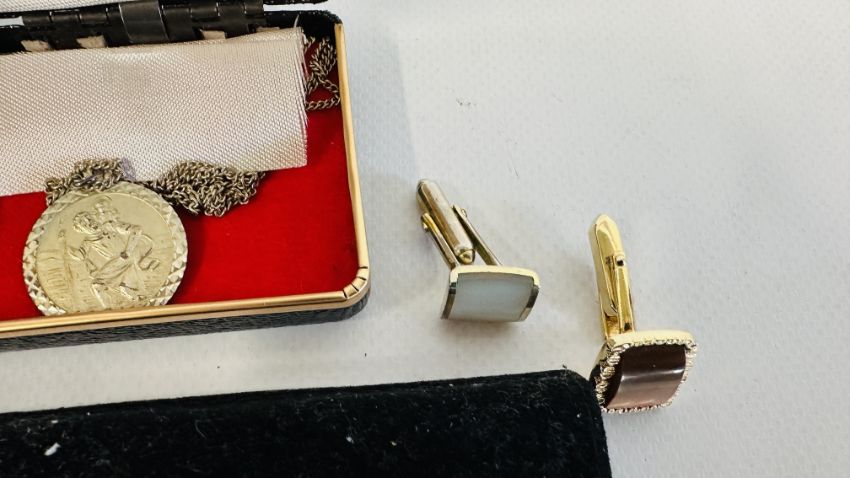 A SILVER NECKLACE AND ST CHRISTOPHER PENDANT, PAIR OF SILVER CUFF LINKS + A STRATTON TIE CLIP AND CUFF LINKS, A WOVEN SILVER NECKLACE WITH 4 SILVER AND WHITE METAL CHARMS, WRIST WATCHES TO INCLUDE SEIKO AND ARAMIS EXAMPLES AND STOP WATCH, ETC.