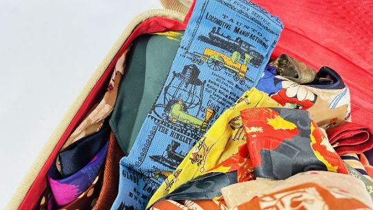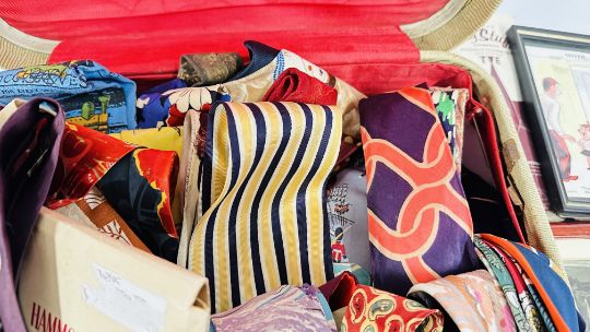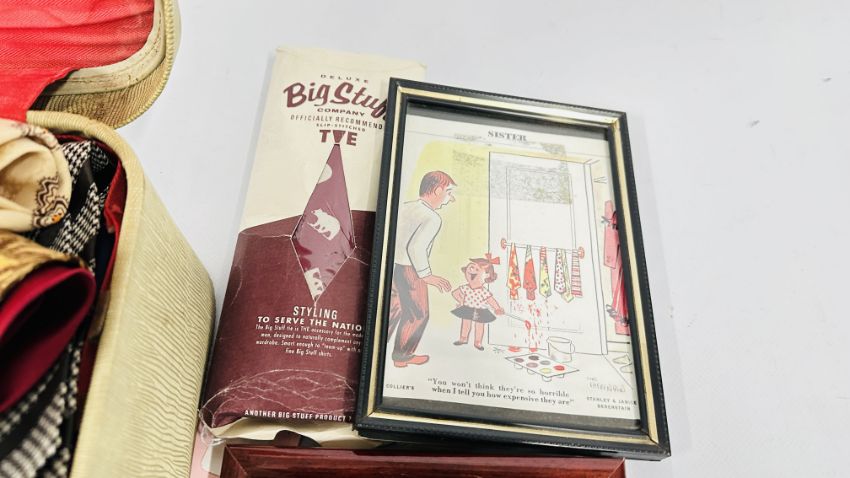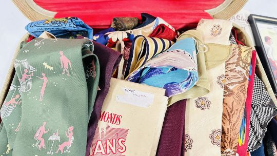 AN EXTENSIVE COLLECTION OF ASSORTED 1930, 40'S, 50'S, 60'S & 70'S VINTAGE TIES TO INCLUDE USA ROCKABILLY SWING TIES TO INCLUDE AN EXAMPLE IN ORIGINAL PACKAGING, USA KINNY "COUNTESS MARA", 2 X CHILD'S TOOTAL TIES AND A RELATED PHOTOGRAPH & CLIPPING + 2 X HAND PAINTED TIES ETC.