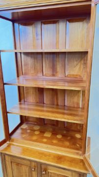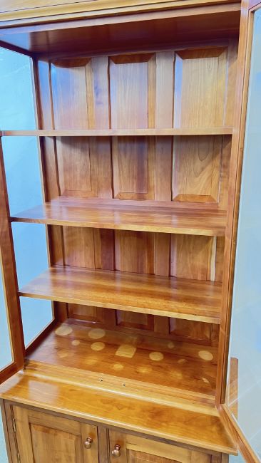 A GOOD QUALITY CHERRYWOOD GLAZED DISPLAY CABINET WITH CUPBOARD BASE, W 97CM X D 50CM X H 205CM.