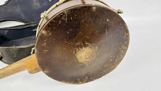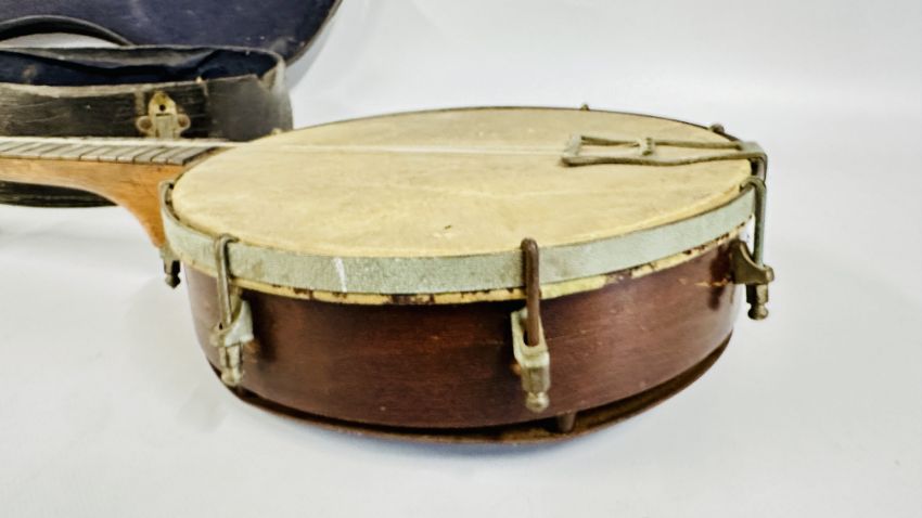 A VINTAGE JOHN GREY & SONS LONDON BANJO BEARING ORIGINAL MAKERS PLAQUE IN ORIGINAL CASE (REQUIRES ATTENTION).