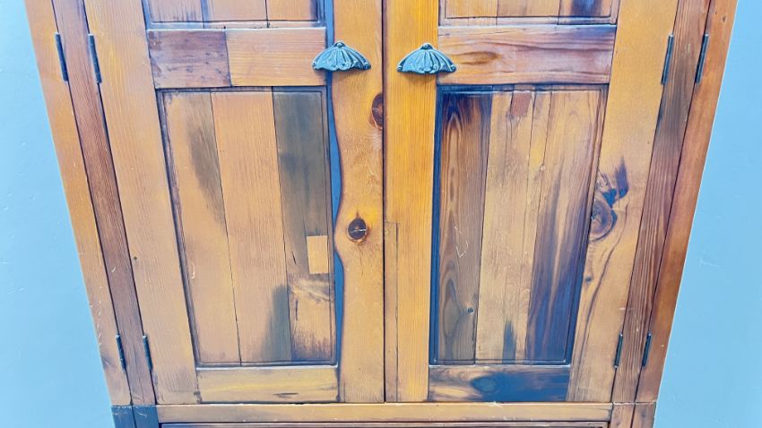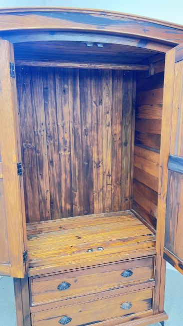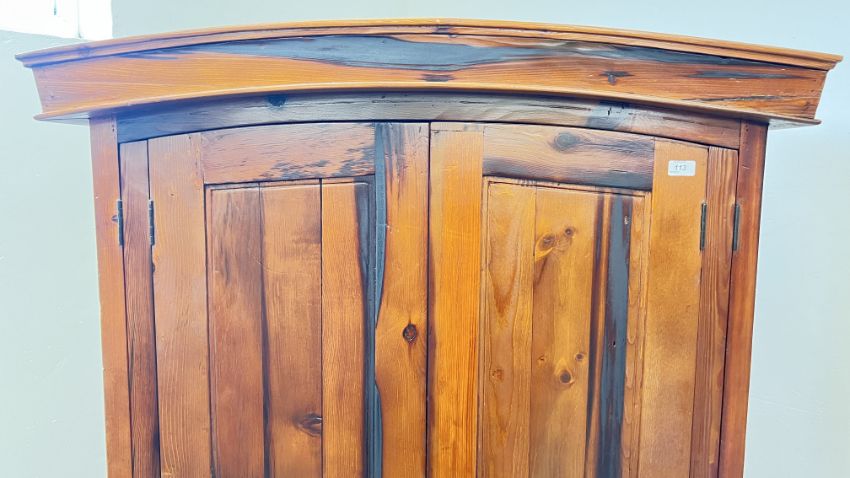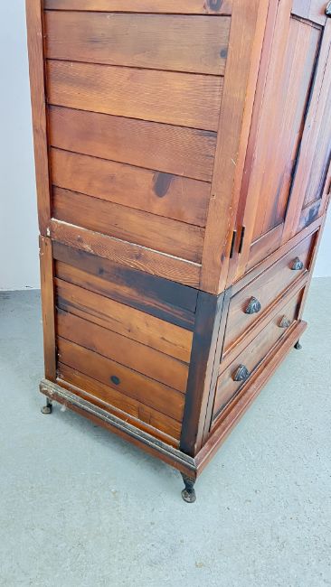 A PINE TWO DOOR WARDROBE ON TWO DRAWER BASE, W 112CM X D 64CM X H 200CM.
