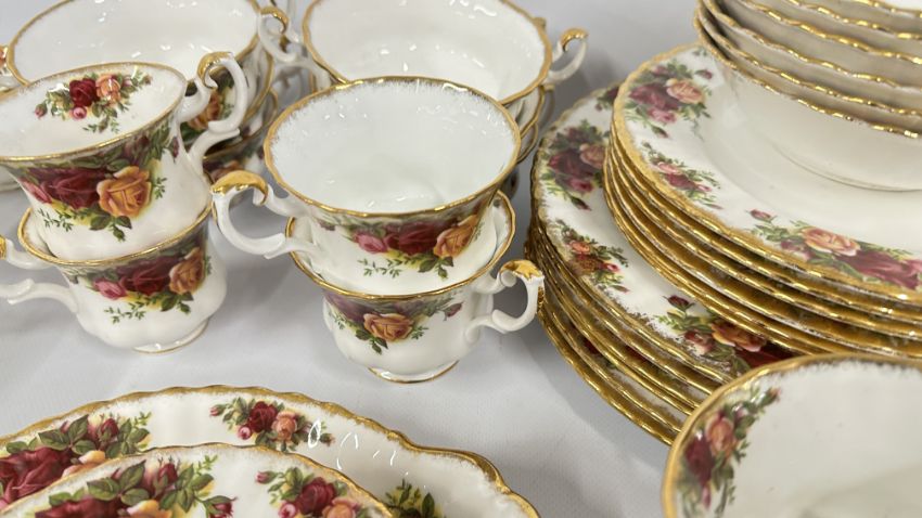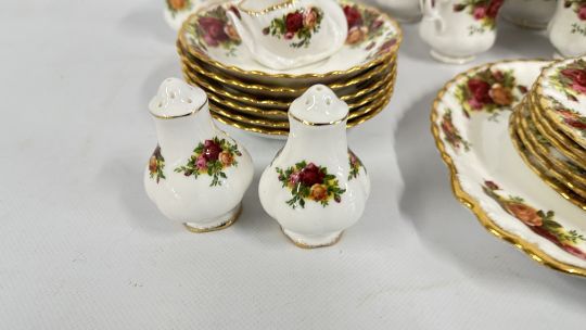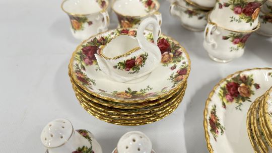 AN EXTENSIVE COLLECTION OF ROYAL ALBERT "OLD COUNTRY ROSES" BONE CHINA TABLE WARES TO INCLUDE 6 X DINNER PLATES, 6 X SIDE PLATES, 6 X DESERT BOWLS, 6 X SOUP BOWLS, GRAVY BOAT AND STAND, SALT AND PEPPER, CAKE PLATE, 6 X CAKE PLATES, 6 X TEA CUPS AND SAUCERS, 6 X COFFEE CUPS AND SAUCERS AND SWAN POSY (60 PIECES).