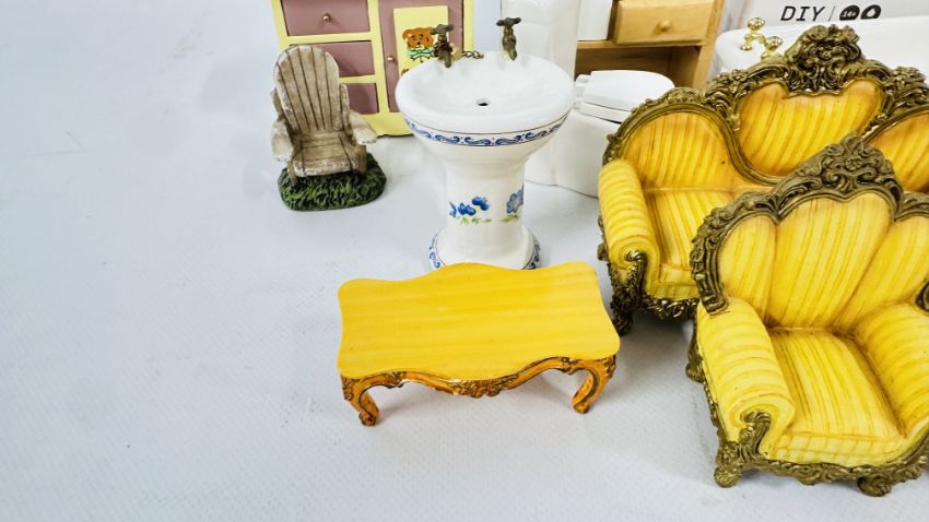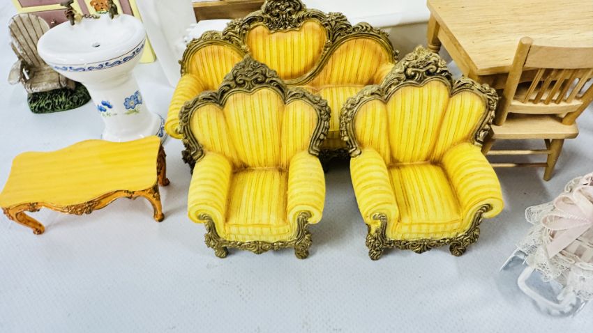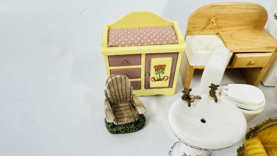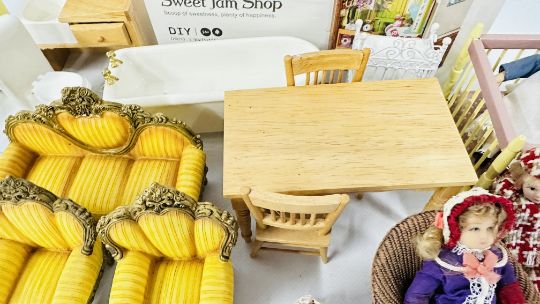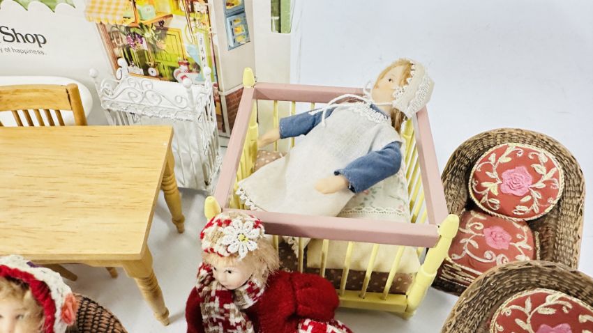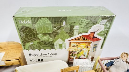 A GROUP OF DOLL'S HOUSE FURNITURE + A BOXED ROLIFE DIY SWEET JAM SHOP.