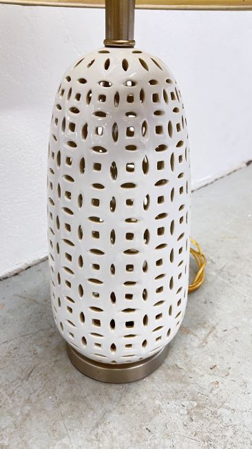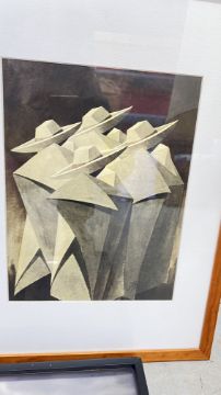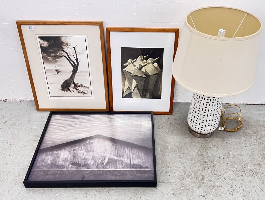 DESIGNER OAK FURNITURE LAND TABLE LAMP, B & W BARN PRINT, DESERT PRINT & ABSTRACT ART PAINTING OF CLOAKED PEOPLE BEARING SIGNATURE AKUDAY.