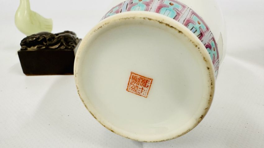 CHINESE HARD STONE GOOSE AND BANGLE PLUS CARVED HARD STONE PAPERWEIGHT WITH MYTHICAL ANIMALS AND C20TH ORIENTAL DECORATED VASE, HEIGHT 16CM.