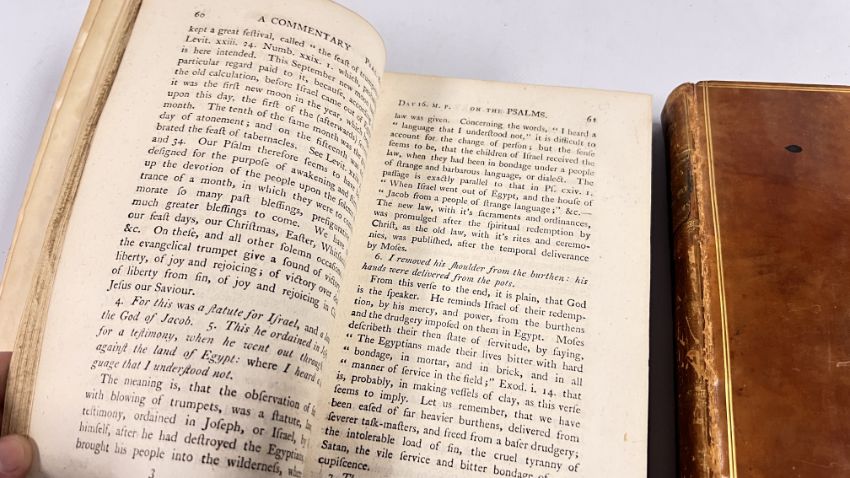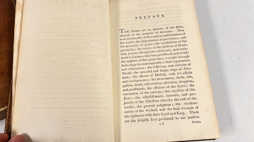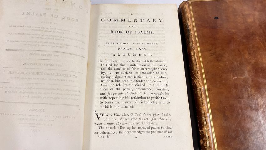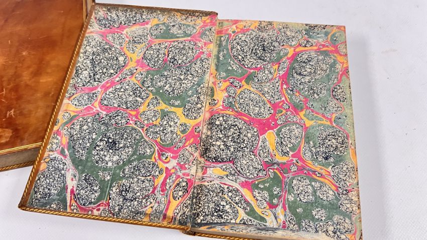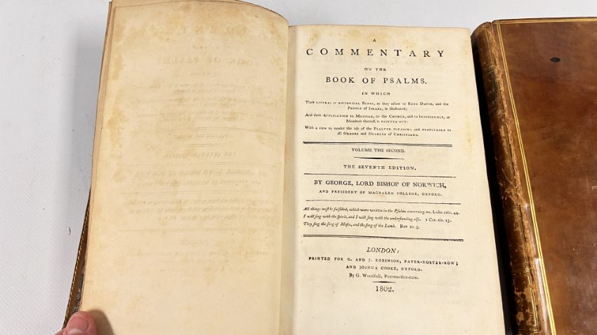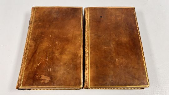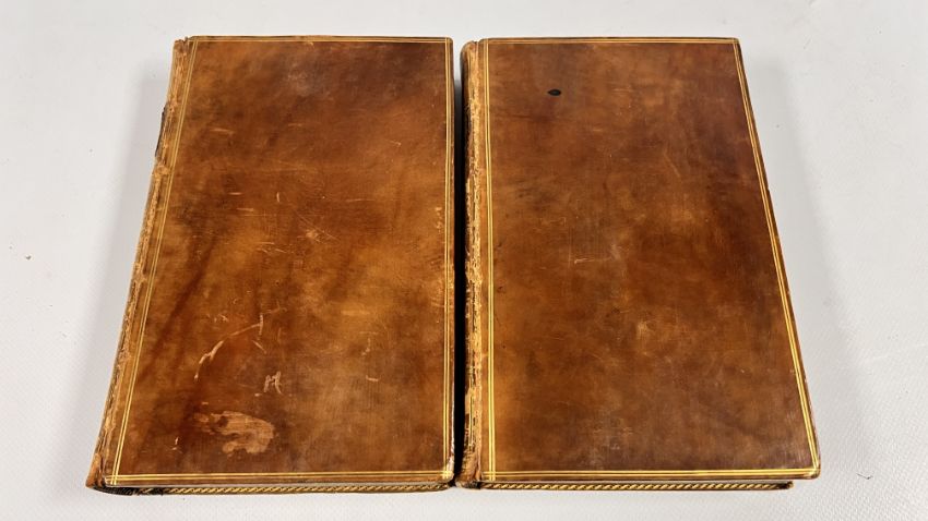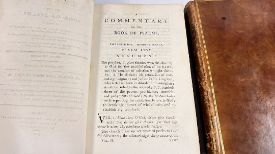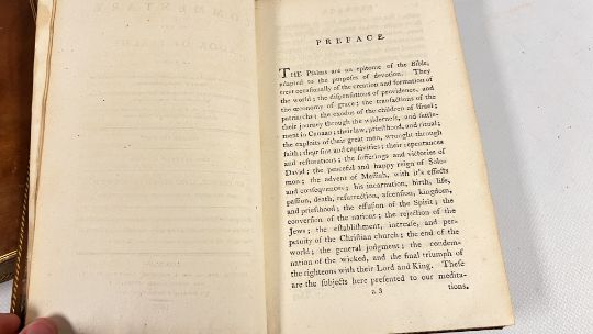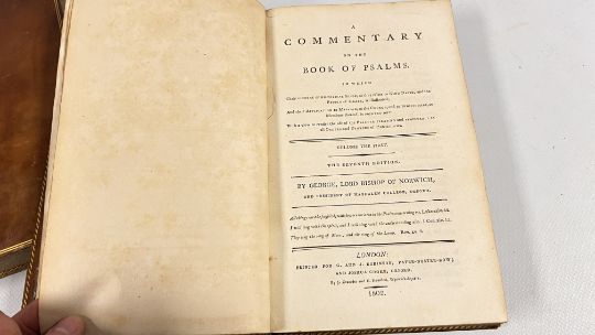 COMMENTARY ON THE PSALMS BY GEORGE HORNE, LORD BISHOP OF NORWICH. PUBLISHED IN LONDON, 1802 FOR G & J ROBINSON. SEVENTH EDITION. FULL POLISHED CALF, LINED IN GILT. GILT EMBELLISHED SPINES WITH PLATES PRESENT, CHIPPED. CLOSED EDGES FLECKED, AND PAPERS MARBLED. SOME FOXING, THOUGH CONFINED TO THE BLANKS MAINLY. BLOCKS SOUND, WITH NO INNER HINGE WEAKNESS. (VOL 1 & VOL 2).